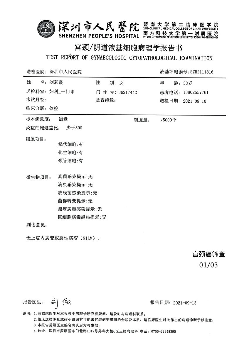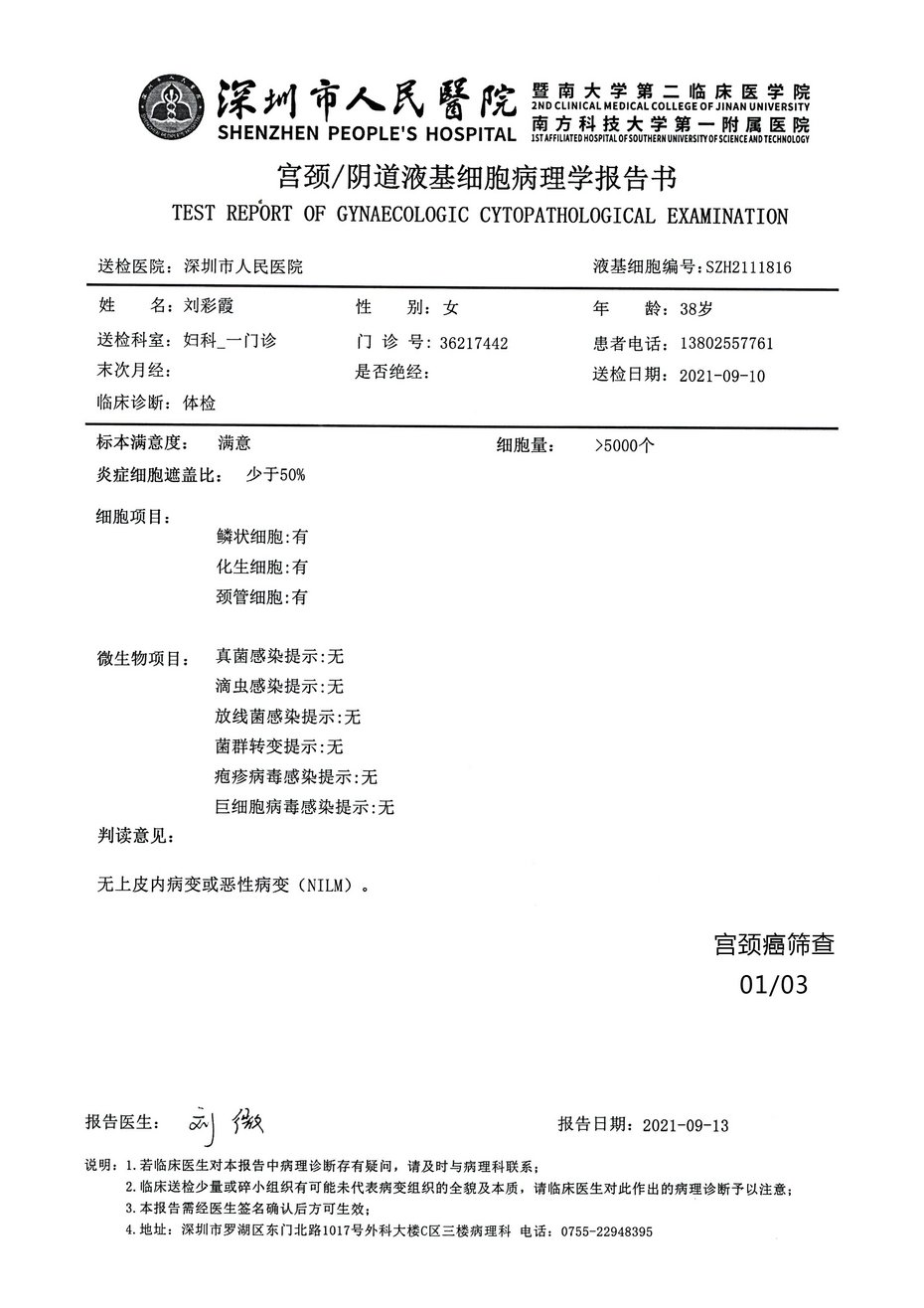 Name: Liu Caizhu Sex: Female Age: 30 Liquid Base Number: S2-2111816