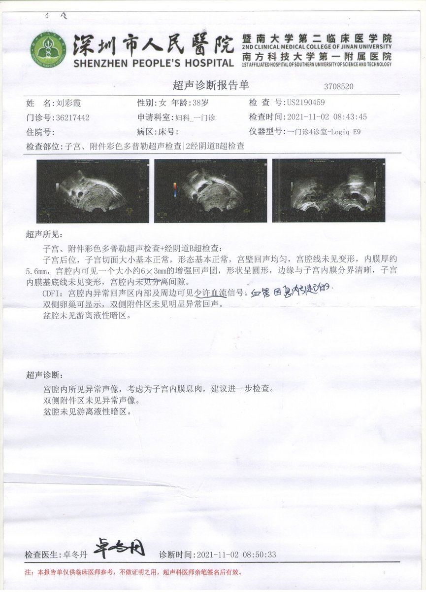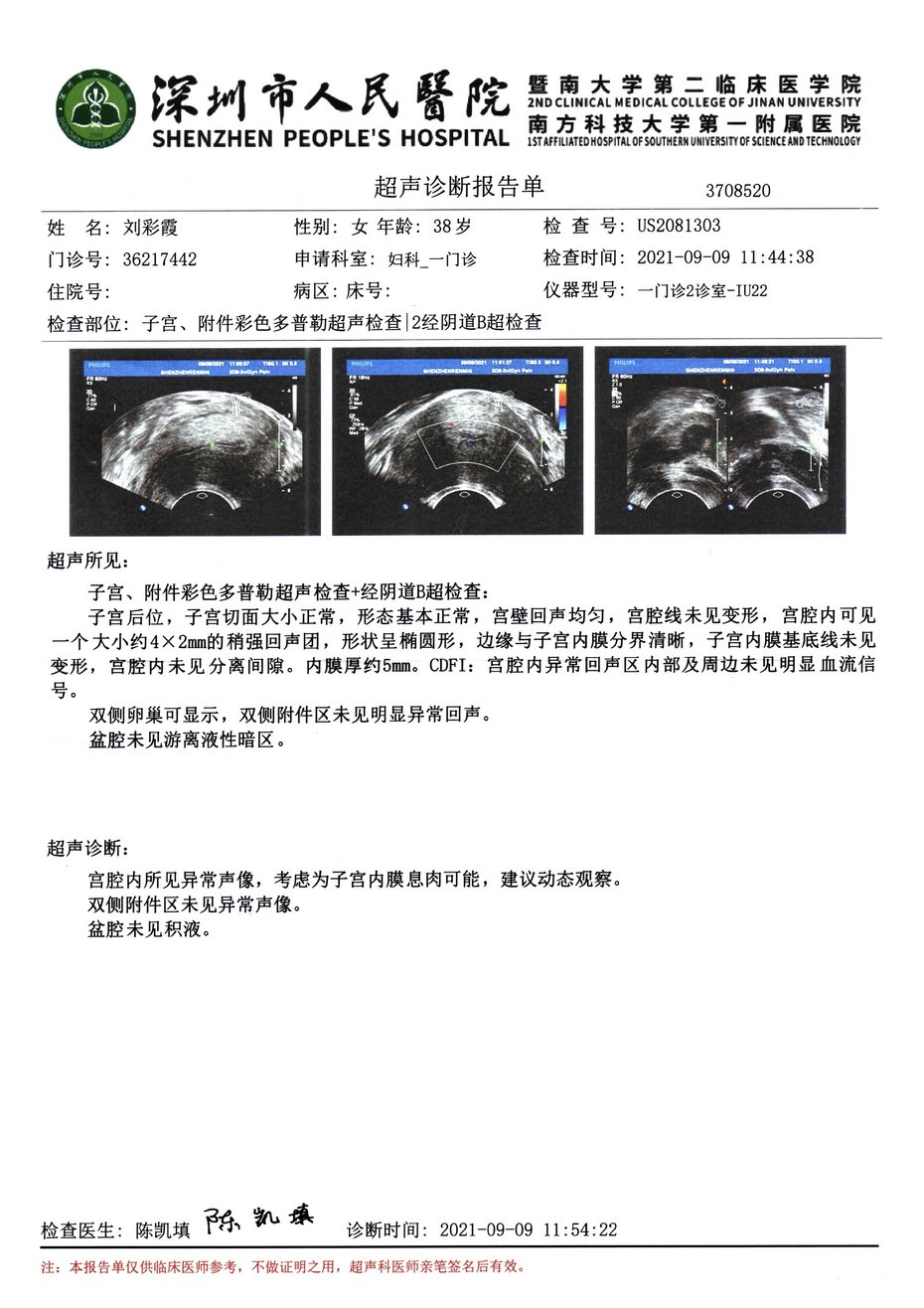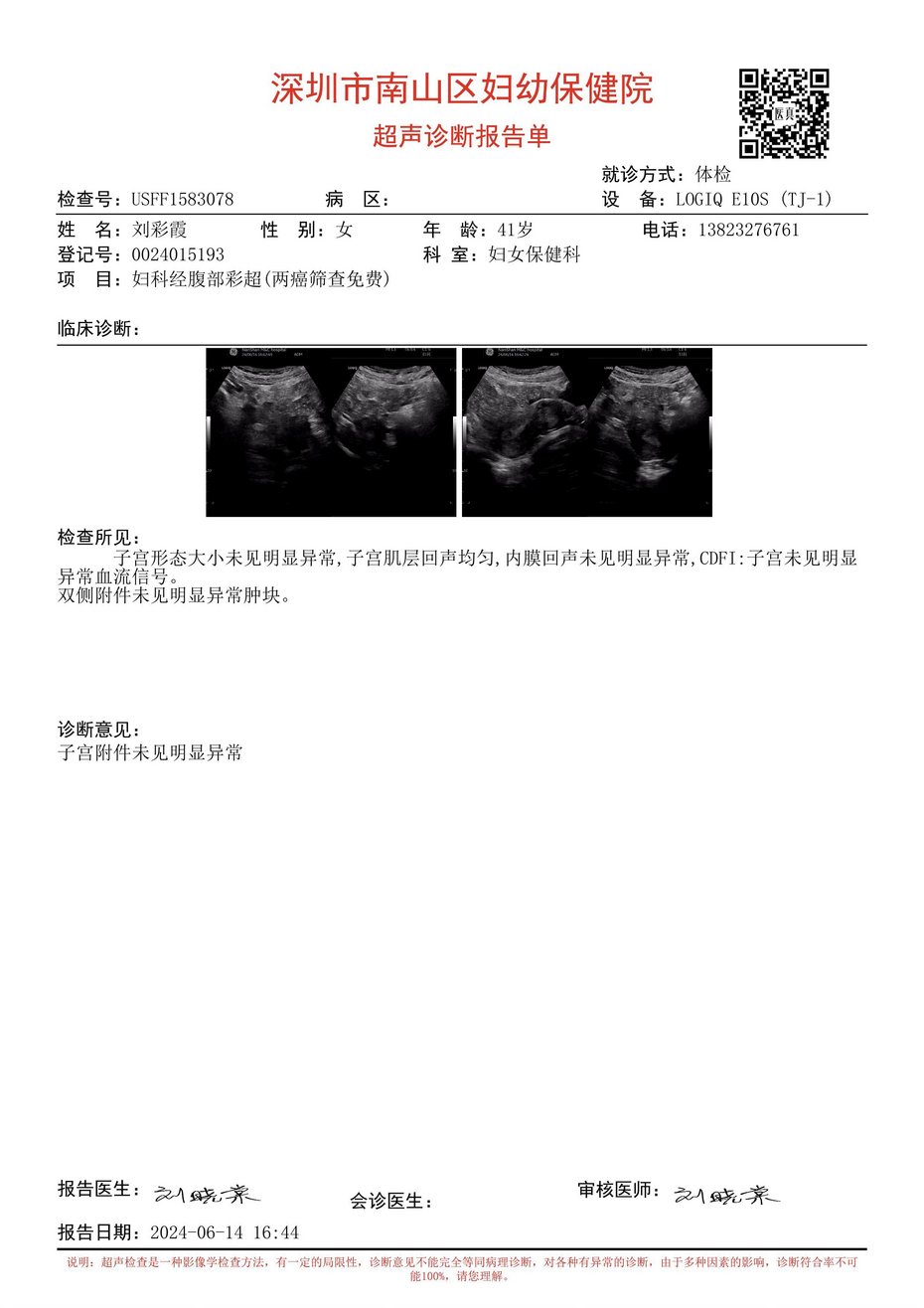 On June 14, 2024, I had a physical examination at the Women and Children's Health Care Hospital in Nanshan District, Shenzhen. The examination results were: the shape and size of the uterus were not significantly abnormal, the uterine myometrium echo was uniform, the endometrial echo was not significantly abnormal, and there was no obvious abnormal blood flow signal in the CDF1 uterus. No obvious abnormal masses were found in both adnexa. All examination results were normal! (See the examination report below)