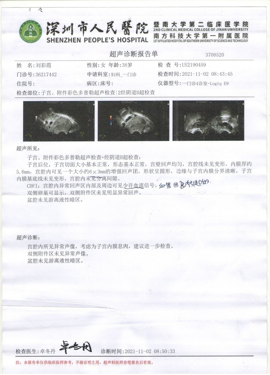 On September 9, 2021, I had a gynecological examination at Shenzhen People's Hospital and was diagnosed with endometrial polyps measuring 4*2mm. The doctor said that I didn't need to worry, and the polyp would be discharged with the menstrual blood, and suggested that I come back for a follow-up examination after the next menstrual period. (See the attached medical report above)