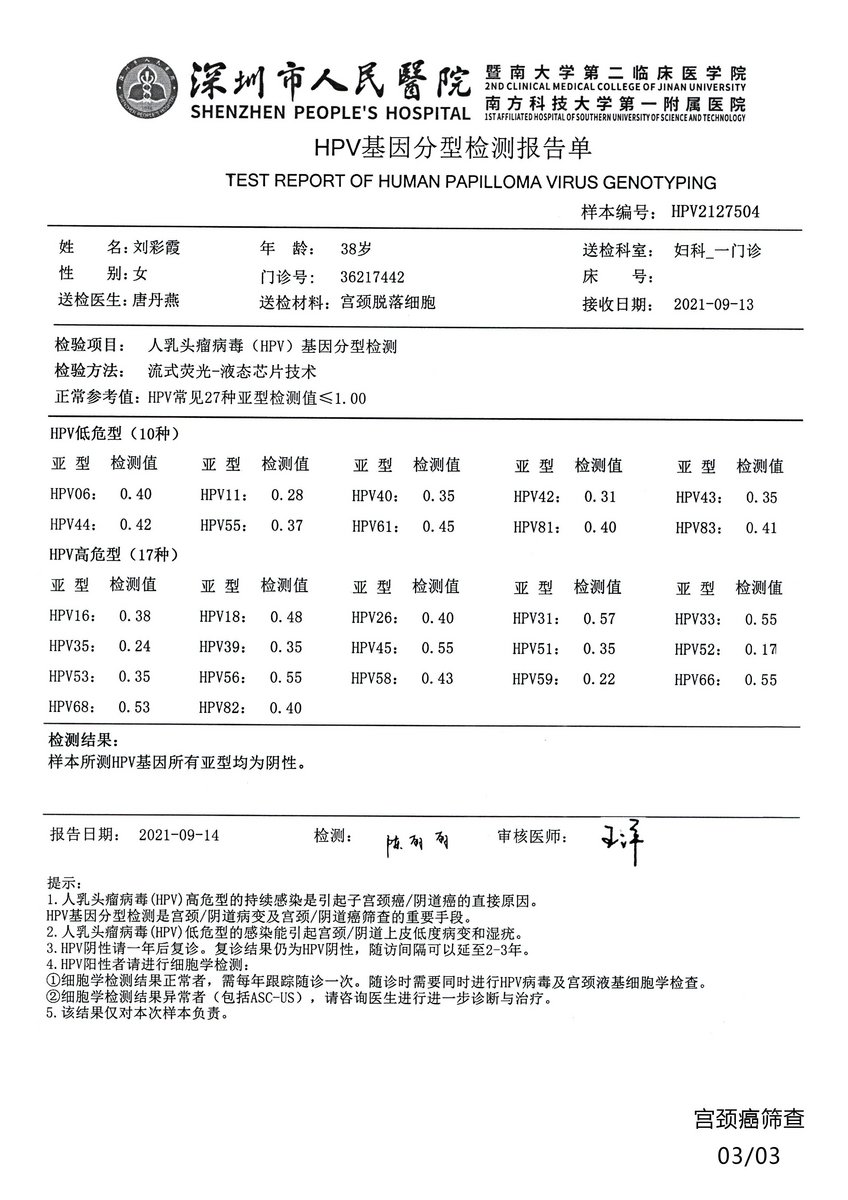 - If the result is negative, please follow up in one year. If the follow-up result is still HPV negative, the follow-up interval can be extended to 2-3 years.